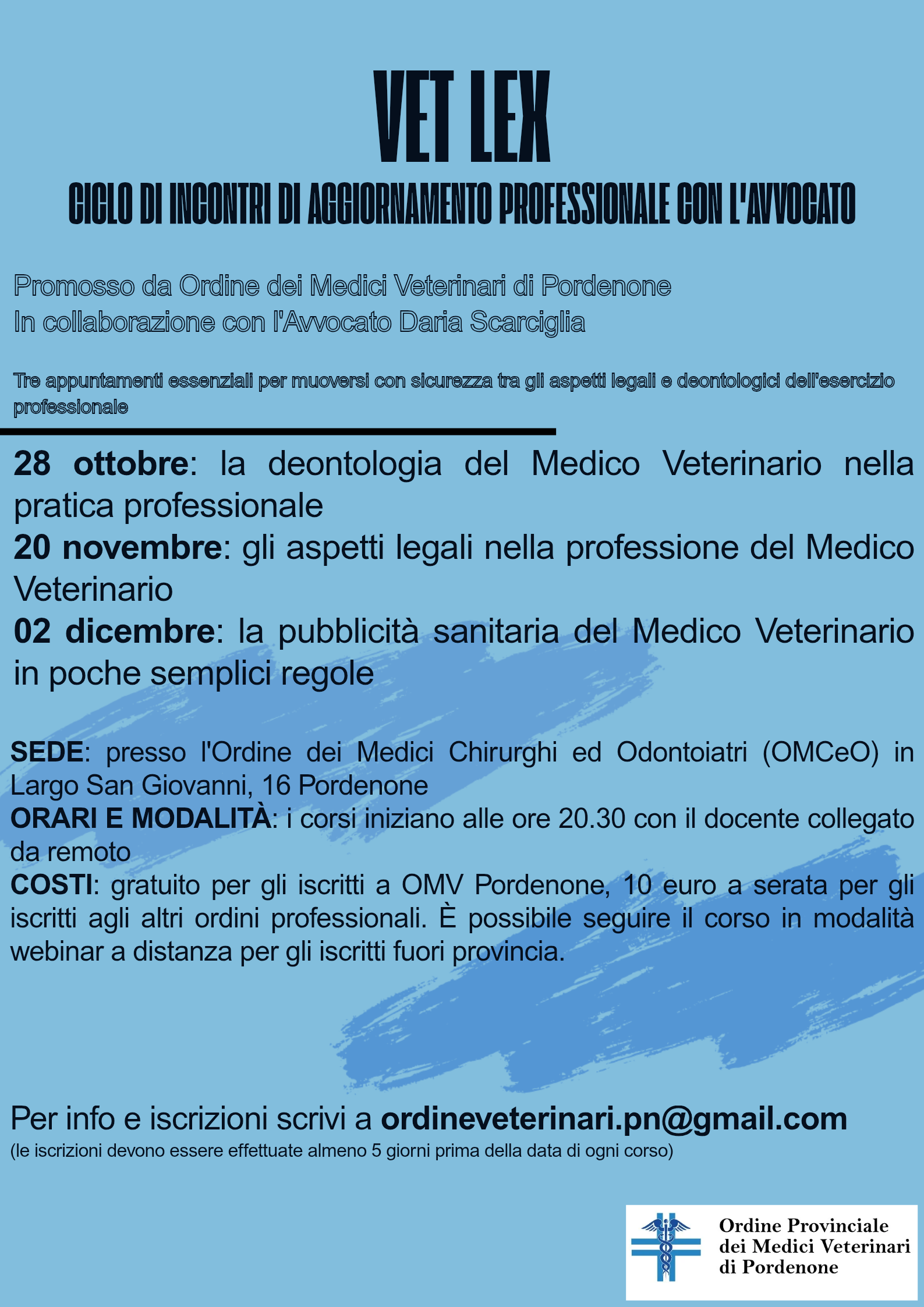 abbiamo il piacere di invitarvi ad un ciclo di incontri di aggiornamento professionale, un'iniziativa promossa dall'Ordine dei Medici Veterinari di Pordenone in collaborazione con l'Avvocato Daria Scarciglia.